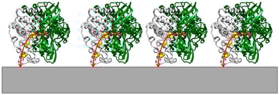 For [NiFe]-hydrogenase absorbed on a graphite electrode, direct interfacial electron transfer is fast and independent to the presence or absence of a mediator [15]. This indicates (i) a direct contact between enzyme and electrode surface so that mediator molecules cannot interfere with electron transfer; (ii) the distal iron–sulfur cluster [FeS]d in close proximity to the electron acceptor; and (iii) a uniform distribution of enzymes on the electrode surface (see Figure 2). When using an artificial soluble electron acceptor (methyl viologen), the measured rates of electron transfer are even slower than those of electrode-associated [NiFe]-hydrogenases [6].