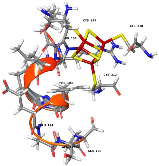 Table 4 gives the calculated electron transfer rates from the distal [FeS]d-cluster in either a histidine or an all-cysteine coordination sphere via amino acid residues along the preferred route D185-S196 (Asp185, Asn186, Cys187, Pro188, Arg189, Leu190, Pro191, His192, Phe193, Glu194, Ala195, Ser196) (see Figure 4). This is the shortest path connecting the distal FeS-cluster with the electrode approaching Ser196 residue (via a short α-helical stretch from residues 185–194).