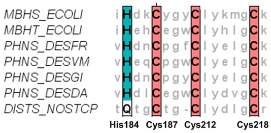 First shell amino acid coordination sphere of the distal FeS-cluster of the small subunit of [NiFe]-hydrogenases (three cysteines (C) 187, 212 and 218 brown, one histidine (H) 184 turquoise, or alternatively, a glutamine (Q) white at that position): MBHS_ECOLI (hydrogenase-1; hyaA; E. coli), MBHT_ECOLI (hydrogenase-2; hybO; E. coli), PHNS_DSEFR (periplasmic [NiFe] hydrogenase small subunit; hydA; D. fructosovorans), PHNS_DESVM (periplasmic [NiFe] hydrogenase small subunit; hydA; D. vulgaris), PHNS_DESGI (periplasmic [NiFe] hydrogenase small subunit; hydA; D. gigas), PHNS_DESDA (periplasmic [NiFe] hydrogenase small subunit; hydA; D. desulfuricans), DIST_NOSTCP (Ni,Fe-hydrogenase I small subunit; Nos7524_1174; Nostoc sp.).