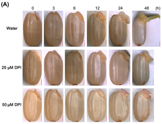 Quantification and histochemical localization of H2O2 were carried out by DAB staining and colorimetrical measurement, respectively, also as described in our previous study [15,36]. For DAB staining, after the rice seeds were incubated in water or with 25 μM DPI for 3, 6, 12, 24 or 48 h, five whole seeds and five half granule seeds with embryo were selected and incubated in 1 mg/mL DAB-HCl (pH 3.8) at room temperature for 30 min and then washed in water and photographed as described above. For quantification, H2O2 was extracted by the homogenization of 30 embryos from each of the indicated time points in 3 mL of cold acetone. The samples were homogenized by Tissuelyser-24 at 4 °C and then the homogenate was centrifuged at 12,000 rpm for 15 min. A 1 mL aliquot of supernatant solution was mixed with 0.1 mL of 5% titanium sulfate in concentrated HCl followed by the addition of 0.2 mL aqueous NH3 (25%) to precipitate the peroxide–titanium complex. The mixture was then centrifuged at 12,000× g for 15 min. The precipitate was solubilized in 3 mL of 2 mM H2SO4. Absorbance was then read at 415 nm. A standard response curve was prepared with a known concentration of H2O2 using the same method as described above.