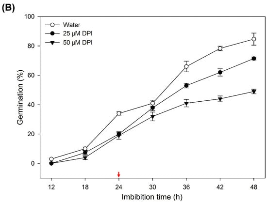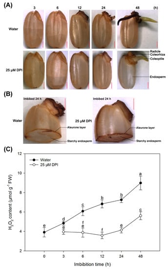 The H2O2 content in the embryo was further quantified by colorimetry (Figure 4C). When seeds were incubated in water, the H2O2 content in the embryo increased progressively during the imbibition process and peaked at 48 h. However, the H2O2 content of embryo incubated in 25 µM DPI was significantly lower than that in water during the germination course, which was similar to the production rate of O2−. These results were in agreement with the histochemical staining.