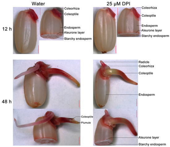 To determine whether the viability of the embryo and endosperm is influenced by DPI, seeds incubated in water or with 25 µM DPI were stained with 2,3,5-triphenyltetrazolium chloride (TTC) and photographed (Figure 2). When seeds were germinated in water, the embryo at 12 h and coleorhiza, radicle and coleoptile at 48 h were all stained, whereas the starchy endosperm showed no staining. Interestingly, the aleurone layer of the whole seed showed negligible staining, which would be related with the uptake of reactive dye TTC. When the seed was cut in half, however, the aleurone layer was also stained. Moreover, when the seeds were incubated with 25 µM DPI, the staining of the embryo at 12 h and coleorhiza, radicle and coleoptile at 48 h was weaker than in water, and some tissues (e.g., zone of coleoptile near coleorhiza) were not stained. Remarkably, staining of the aleurone layer of half seeds was not dramatically inhibited by 25 µM DPI compared with seeds in water. These results demonstrated that DPI specifically reduced the viability of the embryo, especially the coleorhiza and radicle, but not that of the aleurone layer.