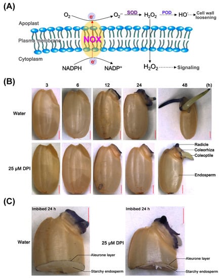 Plasma-membrane NADPH oxidases (NOXs) are the key enzymes in plants for ROS generation [12]. They catalyze the production of the superoxide radical (O2−) by translocating an electron from NADPH inside the cell across the membrane to interact with molecular oxygen via flavin adenine dinucleotide. The O2− then undergoes chemical transformation to yield hydrogen peroxide (H2O2) and O2. Peroxidases then catalyze the formation of •OH from O2− and H2O2 in the apoplast. Because •OH is the ROS with the highest reactivity and shortest lifespan, it can directly cleave cell wall polysaccharides and thus loosen the plant cell wall of the seed endosperm cap in dicots such as cress [13,14]. A previous study has demonstrated that O2−, H2O2 and peroxidase (an alternative marker for •OH production) specifically accumulate in the endosperm cap and radicle of lettuce seeds [15]. Thus, it may be logical to hypothesize that ROS generated by plasma membrane NOXs might also be involved in monocot seed germination.