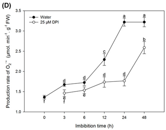 When seeds were incubated with 25 µM DPI, the intensity of staining in the embryo, as well as in the aleurone layer, was reduced, especially at the coleorhiza (Figure 3B,C). The rate of O2− generation in the embryo was also quantified by colorimetry (Figure 3D). When the seeds were incubated in water, the rate in the embryo increased slowly up to 6 h, then rose sharply until 24 h, and remained high from 24 to 48 h. However, the rate was relatively low in the seed embryos in 25 µM DPI, increasing slowly up to 24 h and sharply upregulated after. The results of O2− quantification were consistent with the histochemical staining.