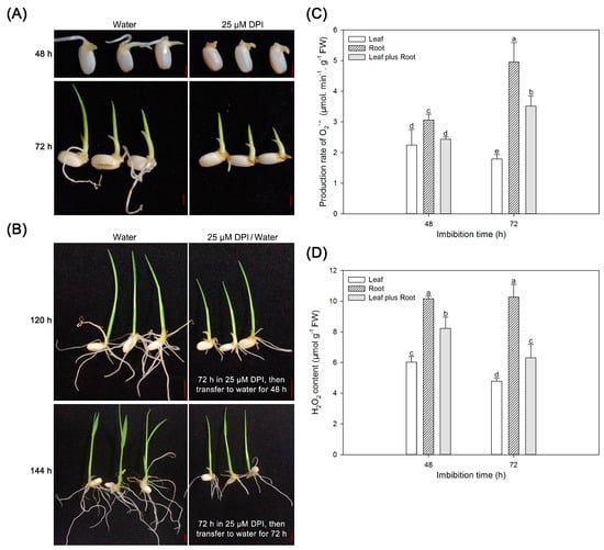 The germination percentage and phenotype of germinating seeds revealed that DPI inhibited radicle elongation. As such, we further investigated whether DPI could also inhibit root growth and development. As shown in Figure 6A and Figure S2, when the seeds were incubated in water for 48 or 72 h, the seminal root elongated rapidly, indicating a strong growth potential. When the seeds were incubated with 25 µM DPI, however, the emergence of the radicle (at 48 h) and elongation of the root (at 72 h) were dramatically suppressed, and roots, if present, were short. Interestingly, the growth of the coleoptile and seedling leaves was barely inhibited by DPI, indicating that the radicle and seminal roots are more sensitive to DPI than the coleoptile and seedling leaves. Moreover, when the seedlings were incubated with 25 µM DPI for 72 h and then transferred to water for 48 or 72 h, the growth of seminal roots recovered to some extent (Figure 6B and Figure S2). Additionally, the rates of O2− and H2O2 production in seedlings (leaf plus root), roots and leaves were further investigated (Figure 6C,D). For whole seedlings cultured in water, O2− production increased significantly from 48 to 72 h, while the H2O2 content decreased significantly. In the leaves of the seedlings, O2− production and H2O2 content decreased from 48 to 72 h. In contrast, in the roots, O2− production increased markedly and H2O2 content remained at a high level when seedlings were incubated in water. These results might suggest that O2− and H2O2 are more important for root growth than for leaf sprouting during seedling establishment, similar to the results for radicle and coleoptile of seeds during rice germination (Figure 3, Figure 4 and Figure 5).