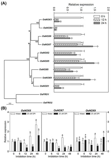 Expression profiles of the typical NOX genes OsNOX1–9 during germination of rice seeds. (A) Phylogenetic relationships of rice NOX family genes and expression profiles of the typical NOX genes (OsNOX1–9, [17]) in embryos assayed by qPCR after seeds had been incubated in water for 0, 12 and 24 h. Data represent the mean ± SE of three biological replicates of 30 embryos (~0.1 g). Significant differences for the qPCR data at 12 and 24 h from those at 0 h were assessed by the Student’s t-test (* p < 0.05; ** p < 0.01); (B) Expression of OsNOX5, 7 and 9 in the embryo assayed by qPCR after seed imbibition in water or with 25 µM DPI for 0, 6, 12, 24 or 48 h. Data represent the mean ± SE of three biological replicates of 30 embryos (~0.1 g). Means denoted by the same letter do not significantly differ at p < 0.05 (Fisher’s least significant difference test).