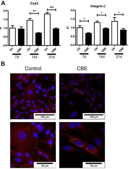 Cx43 is the main gap junction protein in osteocytes. Together with integrins, Cx43 is involved in cellular communication and attachment to extracellular matrix processes required for osteocyte survival [8,9,10]. On the other hand, it has been shown that osteocyte apoptosis can induce the recruitment and differentiation of osteoclast precursors [25]. In this context, we evaluated the expression of several integrins and Cx43 as a possible mechanism leading to osteocyte cell death. The expression levels of CD44, E11/gp38, integrin-α, integrin-β and Cx43 were evaluated in CBE-treated osteocytes on days 7, 14 and 21. As shown in Figure 2A, Cx43 mRNA levels were lower on CBE-treated cells at the end of days 14 and 21, while integrin-β was downregulated at all time points tested. No differences were observed in the rest of the molecules analyzed.