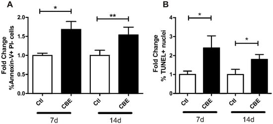 To study the effect of CBE treatment on osteocyte apoptosis, MLO-Y4 cells were treated with 500 µM of CBE for 7 and 14 days. Apoptosis levels were evaluated by Annexin-V and TUNEL staining.