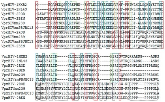 Amino acid sequence alignment of Vpr and Vpx proteins from human Immunodeficiency virus type 1 (HIV-1) and type 2 (HIV-2), and simian immunodeficiency viruses (SIV) using Fast Fourier Transform (MAFFT) at the EMBL-EBI server (available on 20 October 2016 http://www.ebi.ac.uk). Color code of amino acids within rectangles: red = fully conserved residues in all Vpr and Vpx proteins; blue = fully conserved residues only in Vpr proteins; dotted green = residues with similar properties in Vpr proteins; dotted black = fully conserved residues only in Vpx proteins.
