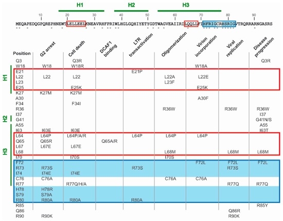 The comparison of amino acid sequence between Vpr proteins from different HIV-1 subtypes reveals a high degree of conservation [151]. Several approaches have been undertaken to determine the relationships between sequence amino acid positions and functionality of Vpr. Analysis of Vpr from cultured and natural HIV-1 variants together with site-directed mutagenesis studies have suggested specific domains and residues in the protein sequence that are associated with virus cytopathogenicity and with disease progression (Figure 2).