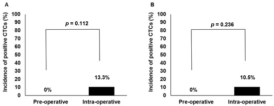 Figure 2A,B showed perioperative CTC detection rates in patients undergoing HDR and LDR brachytherapy, respectively. Intraoperative CTCs were detected in 4 of 30 (13.3%) patients and 3 of 29 (10.5%) patients with HDR and LDR brachytherapy, respectively. While intraoperative CTC detection rates were relatively high when compared with preoperative ones in each group, according to a Fisher’s exact test, the differences did not reach statistical significance in the HDR brachytherapy group (p = 0.112) or in the LDR brachytherapy group (p = 0.236).