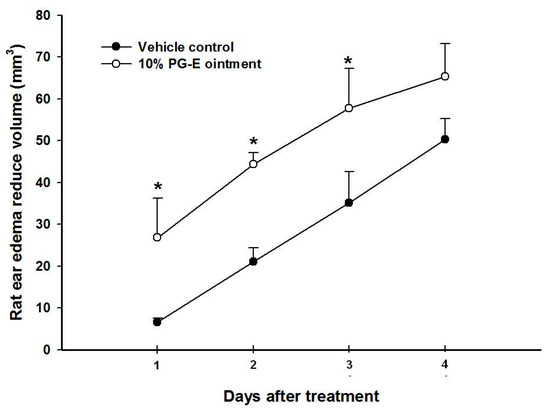 The animal use protocol was reviewed and approved by the institutional Animal Care and Use Committee or Panel (IACUC/IACUP), Taipei Medical University (IACUC Approval no. LAC-97-0122). All methods involved in animal experiments were performed in accordance with the previous relevant guidelines and regulations. Female Wistar rats weighing 250 ± 20 g were bought from BioLASCO Taiwan (Yilan, Taiwan) and kept on a 12 h light/12 h dark cycle at 21 ± 2 °C with food and water ad libitum. P. acnes (8 × 107 colony-forming units (CFU)/20 µL) was intradermally injected into the left ear of rats to induce edema (Figure 8). PBS (phosphate-buffered saline) was injected into the right ear as a vehicle control [29]. One hour before the injection, PG-E ointment (10% PG-E in hydrophilic ointment) was administered (eight rats per group) on the skin surfaces of the left ear. The perimeter of the ear edema included diameter and height after P. acnes or PBS injection after 1–4 days were measured by calipers. Volume of ear edema could be calculated using multiplication by diameter, height, and circular constant. In the vehicle control group, the rat ear edema reduce volume was calculated as the original volume of ear edema after the PBS injection minus the volume of ear edema after injection on days 1, 2, 3, and 4. In the PG-E ointment group, the rat ear edema reduce volume was calculated as the original volume of ear edema after the P. acnes injection minus the volume of ear edema administrated with PG-E ointment after injection on days 1, 2, 3, and 4.