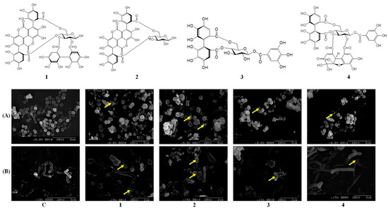 Shrinkage and damage of S. aureus (A) and P. acnes (B) after treatment with four hydrolysable tannins isolated from pomegranate extract (PG-E): punicalagin (1), punicalin (2), strictinin A (3), and granatin B (4); All photos were taken with scanning electron microscopy; C: control group; The concentration of 1 to 4 was 100 µg/mL; Data are from three separate experiments, the picture of one of which is shown; The arrow indicates a disruption site of bacteria; Scale bar of control group is 5 µm; Scale bar of four hydrolysable tannins against S. aureus and P. acnes is 5 µm and 2 µm, respectively.