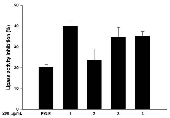 Lipase is an enzyme that hydrolyzes lipids. Some bacteria, such as P. acnes, can secrete lipase to resolve lipids and facilitate lipid-related nutrient absorption from an external medium. In this study, a fluorometric assay of lipase activity was administrated with and without PG-E and the four hydrolysable tannins. Compared to the control, PG-E (200 µg/mL) inhibited lipase activity by 20% as shown by a decrease in lipase substrate degradation. The anti-lipase effects of the essential oil compositions of pomegranate peel extracts have been previously reported, but the principle active principle components were not discussed [25]. In this study, three hydrolysable tannins, 1, 3, and 4, at 200 µg/mL significantly inhibited the lipase activity by 39.8%, 34.7%, and 35.2%, respectively (Figure 3).