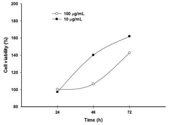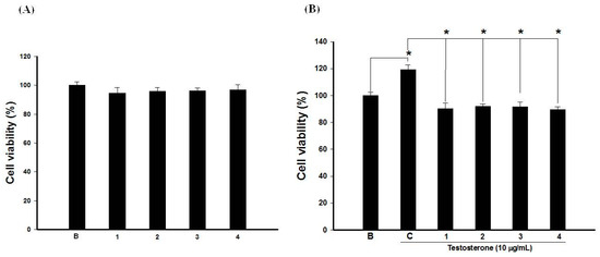 HaCaT cells, a human keratinocyte cell line, were cultured in DMEM with 10% FBS, 1% penicillin-streptomycin, and 1% l-glutamine at 37 °C and 5% CO2. HaCaT cells (2 × 104 cells/well) were seeded in 96-well plates and co-treated with testosterone (10 µg/mL), and test samples were incubated for 18 h [31]. Cell proliferative activity was detected by an MTT assay.