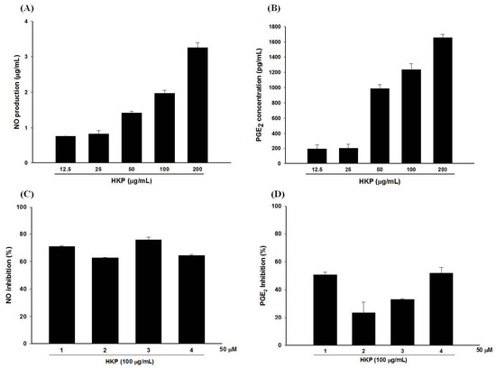 In our previous study, we showed the anti-inflammatory effects of PG-E and four hydrolysable tannins against LPS (lipopolysaccharide)-treated RAW 264.7 cells [12]. Moreover, in this study, we used HKP (heat-killed P. acnes), instead of LPS, to simulate the irritation and inflammation caused by a P. acnes infection. As shown in Figure 6A,B, HKP at 25–200 µg/mL dose-dependently and significantly induced NO (nitric oxide) and PGE2 (Prostaglandin E2) production by RAW 264.7 cells. However, a good relationship between the inflammatory response and the dose of HKP occurred at 50–200 µg/mL. Ultimately, we chose 100 µg/mL of HKP as our inflammation induction dosage. Compounds 1, 2, 3, and 4 at 50 µM displayed over 50% NO inhibitory effects against HKP-induced RAW 264.7 cells (Figure 6C). In addition, 1 and 4 at 50 µM also significantly inhibited about 50% of PGE2 production in HKP-treated RAW 264.7 cells (Figure 6D).