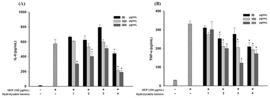 Cytokine, such as IL-8 (interleukin 8) and TNF-α (tumor necrosis factor-α), releases are also key points in the inflammatory status of human acne lesions [28]. As shown in Figure 7, HKP (100 µg/mL) obviously induced IL-8 and TNF-α production in a human monocytic cell line. In Figure 7A, the four hydrolysable tannins inhibited IL-8 and TNF-α production in dose-dependent manners at 50–200 µg/mL, and compound 4 had the strongest inhibitory activity. Anti-TNF-α activities of pomegranate polyphenols are shown in Figure 7B. Compounds 2, 3, and 4 exhibited significant inhibitory activities against TNF-α production, with 4 also displaying the strongest effect. This is the first time that Compound 4 has been reported to have anti-inflammatory cytokine effects.