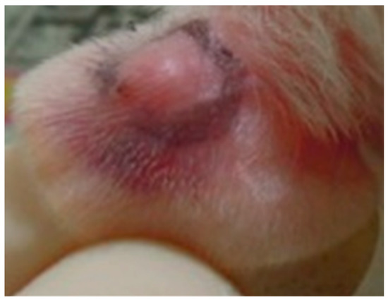 The skin toxicity of PG-E was evaluated from a single topical application in Wistar rats. Twenty-four hours before the test, the backs of rats were shaved free of hair (2.5 × 2.5 cm2 at each site) and checked for any abnormalities (integrity and allergies). An appropriate concentration of PG-E (50 µL per sample) was smeared onto the shaved back of a Wistar rat. The patches were secured for a 4 h exposure period and removed with distilled water. At 24 h and 48 h after the application of PG-E, skin irritation was observed, and the extent of the evident skin allergic reaction was evaluated for each test animal. The acute primary irritation test was applied following the classic Draize test [17].