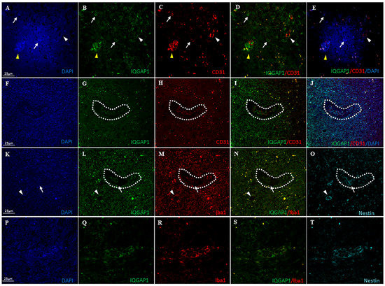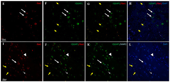 Regarding IQGAP1−Iba1 coexpression experiments, while few IQGAP1+ cells did not co-stain with Iba1 (white arrows in Figure 3), many others were positive for Iba1 (Figure 3 yellow arrows in A–D; white arrows in E–H), confirming the macrophage lineage of such cells. Frequently IQGAP1+/Iba1+ macrophages were detected in areas of high micro-vessel concentration (Figure 3E–H; Supplementary Materials, Figure S3).