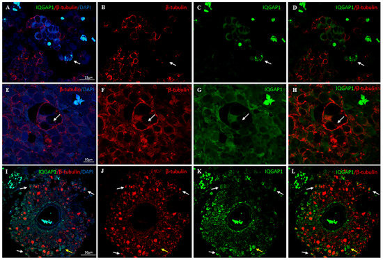 A colocalization of β-tubulin with F-actin and IQGAP1 was also observed in short cell protrusions, while in larger protrusions this colocalization often could only be observed at the basal pole of the structure; in the apical pole only β-tubulin was detected (Figure 5E–L). Moreover, in several cells, co-staining for β-tubulin and for IQGAP1 was detected at membrane ruffles, in cytosol and/or in the nuclear envelope (Figure 5).