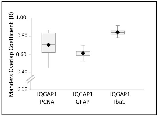 Statistics: Figure 6 shows a box-and-whisker plot illustrating the colocalization analyses of IQGAP1 protein with GFAP, PCNA or Iba1 obtained using the ImageJ Manders’ coefficients plug-in. The range value of Manders’ Overlap coefficient (R) is 0–1, with 0 representing low colocalization, and 1 high colocalization. Boxes indicate interquartile ranges, whiskers indicate ranges of maximal and minimal values. Supplementary Materials Table S1 shows the mean values and the standard deviations of R obtained from this analysis.