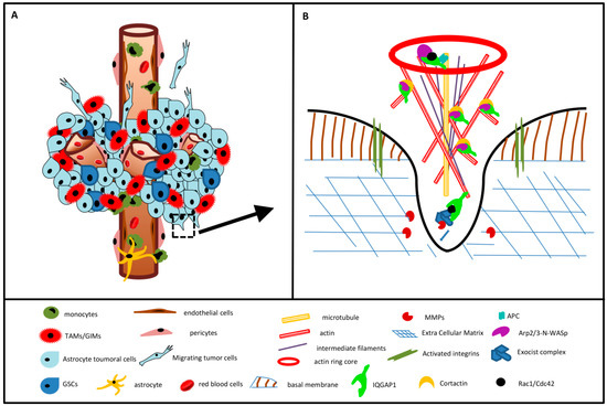 Glioblastoma multiforme and Invadopodia models. (A) GBM cellularity: Most GBM cell kinds, for different scopes, generate podosome/invadopodia structures; (B) Box in (A): IQGAP1 coordinates actin assembly and the exocytosis trafficking machinery in podosome/invadopodia formation.