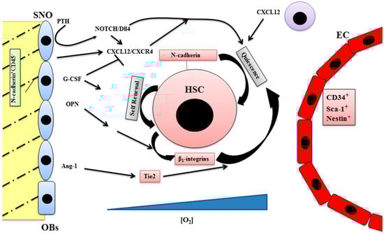 Other osteoblast and HSCs surface molecules are involved in the regulation of endosteal HSCs’ fate. It has been demonstrated that HSCs that adhere to osteoblasts on the bone surface express angiopoietin receptor-2 (Tie2), while the lining cells, in adult BM, produce angiopoietin-1 (Ang-1). The activation of Tie-2 by Ang-1 in vitro induces the adhesion of the two types of cells and consequently the immature HSCs phenotype. Moreover, Ang-1 promotes quiescence, enhances the survival of HSCs, and protects them from various stresses [16,17].