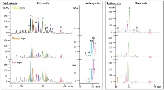 Comparison of high performance liquid chromatograms of Primula veris L. petal and leaf extracts covering flavonoid glycosides at 280 nm and anthocyanins at 520 nm. Identical compounds are marked with the same color and the letters A to P: A: (+)-Catechin (yellow); B: Methyl-myricetin-trihexoside (light blue); C: Quercetin-trihexoside (orange); D: Kaempferol-3-O-diglucoside-7-O-glucoside (pink); E: Quercetin-3-O-gentiobioside (blue); F: Kaempferol-3-O-galactoside-rhamnoside-7-O-rhamnoside (light green); G: Quercetin-methylether-rhamnoside-glucoside-rhamnoside (brown); H: Quercetin-3-O-rutinoside (grey); I: Methyl-quercetin-dihexoside (purple); J: Kaempferol-3-O-rutinoside (light red); K: Methyl-quercetin-rhamnoside-hexoside (red); L: Cyanidin-hexoside (light purple); M: Cyanidin-glucoside (dark green); N1: Coelution of peonidin-dihexoside and peonidin-hexoside (aqua); N2: Coelution of peonidin-hexoside and malvidin-hexoside (aqua); O1: Coelution of malvidin-hexoside and peonidin-hexoside (purple); O2: Peonidin-dihexoside (purple); P: Malvidin-hexoside (apricot).