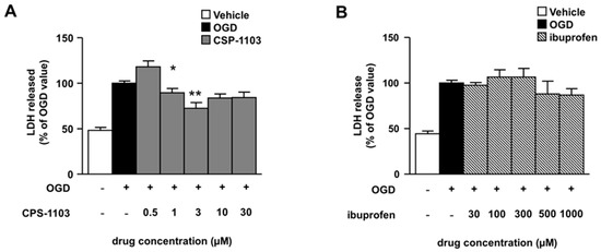 Following OGD, primary cultures of mouse cortical neurons have been shown to undergo apoptosis prior to necrosis. Neuronal cells display TUNEL-positivity and release of cytochrome c in the cytosol within 6 h after the OGD, in the absence of lactate dehydrogenase (LDH) release. A secondary necrosis was revealed by the progressive release of cellular LDH that became clearly detectable in the culture medium 24 h after the OGD [22,23]. The effects of CSP-1103 and ibuprofen on neuronal injury were firstly evaluated at the end of the 24 h recovery period by measuring LDH release (Figure 1).