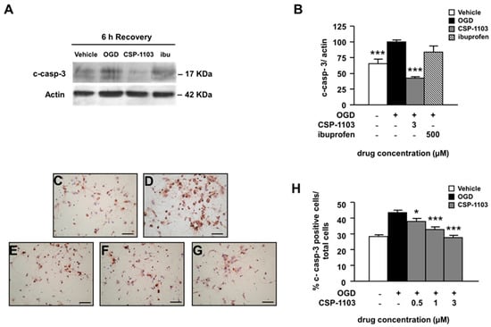 To examine the apoptotic cascade induced by OGD, we measured the activity of caspase-3, a member of the cysteine-dependent, aspartate-specific, proteolytic enzymes family that plays a central role in the propagation of the apoptotic processes. We checked the level of cleaved caspase-3 protein (c-casp-3) in cytosolic extracts of neurons exposed to OGD and treated with the vehicle or the drugs for 6 h in the post-OGD period. Data analysis from western blot (WB) revealed that CSP-1103 at 3 µM significantly reduced caspase-3 cleavage (Figure 2A,B). Conversely, ibuprofen did not modify caspase-3 cleavage, in line with the lack of neuroprotective activity of the drug shown by the LDH release assay (Figure 2A,B).