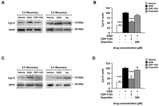 Effect of CSP-1103 and ibuprofen on cytochrome c in cortical neurons exposed to OGD. (A) Representative images and (B) densitometry analysis of WB for Cyt C in cytosolic extracts after 2 h of recovery. CSP-1103, but not ibuprofen, reversed the OGD-induced cytochrome c release from mitochondria after 2 h of recovery. Bars (mean ± SEM) represent the percentage of the Cyt C/actin ratio relative to the OGD value. (C) Representative images and (D) densitometry analysis of WB for Cyt C in cytosolic extracts after 6 h of recovery. The pro-apoptotic release of cytochrome c was blocked by CSP-1103 treatment of neurons after 6 h of recovery. Bars (mean ± SEM) represent the percentage of the Cyt C/actin ratio, relative to the OGD value. *** p < 0.001 vs. OGD value. +, presence of OGD; −, absence of OGD or treatment.