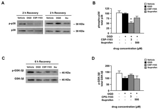 A signaling molecule also involved in the pathogenesis of post-ischemic brain injury is the glycogen synthase kinase-3β (GSK-3β) [31,32]. Since chronic treatment with CSP-1103 was found to reduce the brain level of GSK-3β and concomitantly increase the kinase phosphorylated inactive form in a mouse model of AD [33], we investigated one possible rapid activation of the kinase in neuronal cultures exposed to OGD. The immunoblot analysis of either the inactive (pSer9) GSK-3β or total GSK-3β was performed in cell extracts 6 h after the OGD. The p-GSK-3β/GSK-3β ratio showed only a trend to decrease 6 h after the OGD exposure, consistent with a minor, or just initial, activation of GSK-3β at that time [34]. The trend was reverted by CSP-1103, but not by ibuprofen (Figure 4C,D). No differences were found in the total GSK-3β level both in vehicle and treated neurons exposed to OGD (Figure S2).