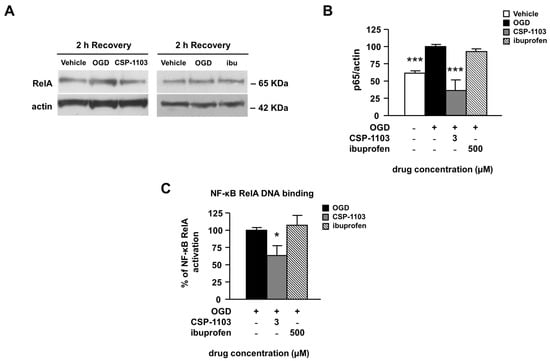 Finally, we evaluated the activation of nuclear factor κB (NF-κB), a constitutively expressed transcription factor involved in pro-apoptotic and pro-inflammatory gene expression [35]. We measured the nuclear translocation of NF-κB by WB analysis of the RelA subunit in nuclear extracts from neuronal cells exposed to the vehicle or the drugs in the 2 h post-OGD. CSP-1103, but not ibuprofen, reduced the immunoreactivity of the RelA subunit in nuclear extracts, suggesting a reduced nuclear translocation (Figure 5A,B).