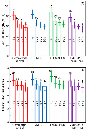 Figure 1 plots (A) flexural strength; and (B) elastic modulus of the composites (mean ± SD; n = 6). Mechanical properties indicated a decrease during the first month of water-aging, with little further decrease observed from 30 to 180 days. After the 180 day immersion, the strength and modulus of the 3MPC + 1.5DMAHDM composite were similar to those of the commercial control (p > 0.1).