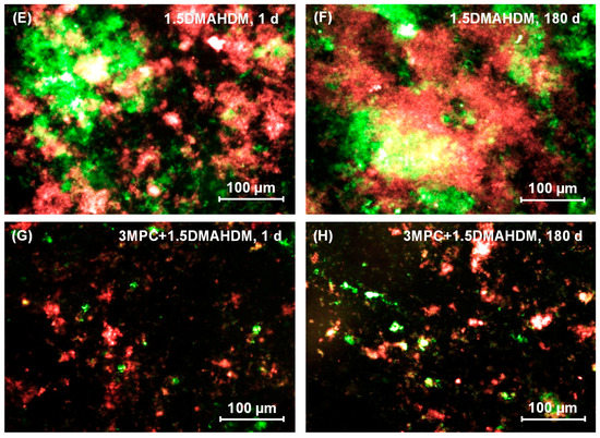Representative live/dead images of two-day biofilms on composites: (A,B) Commercial control at 1 and 180 days (d), (C,D) 3MPC at 1 and 180 d, (E,F) 1.5DMAHDM at 1 and 180 d, and (G,H) 3MPC + 1.5DMAHDM at 1 and 180 d. Live bacteria were stained green, and dead bacteria were stained red. When live/dead bacteria were in close proximity of each other, the staining exhibited yellow/orange colors. In (A), the commercial control had mostly live bacteria. In contrast, in (C), the 3MPC composite had much less bacterial attachment. In (E), the composite with 1.5% DMAHDM had substantial amounts of dead bacteria with red staining. In (G), the 3MPC + 1.5DMAHDM composite had less bacterial coverage, and the biofilms consisted of mostly compromised bacteria. As shown in (B,D,F,H), there was no significant difference between 1 and 180 d.