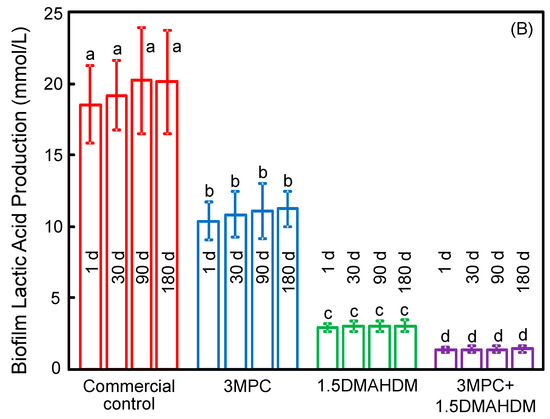 (A) Metabolic activity; and (B) lactic acid production (mean ± SD; n = 6). The composite with 3% MPC + 1.5% DMAHDM had the least metabolic activity and lactic acid production. Water-aging for 180 days (d) did not decrease the antibacterial function, compared to 1 day (p > 0.1). Bars with dissimilar letters indicate values that are significantly different from each other (p < 0.05).