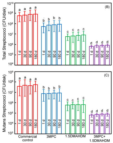 Colony-forming unit (CFU) counts for: (A) total microorganisms; (B) total streptococci; and (C) mutans streptococci (mean ± SD; n = 6). CFU counts on the 3MPC + 1.5DMAHDM composite were three orders of magnitude lower than commercial composite (p < 0.05). There was no significant difference of CFU before and after 180 days (d) (p > 0.1), demonstrating that the anti-biofilm function was not lost in long-term water-aging. Bars with dissimilar letters indicate values that are significantly different from each other (p < 0.05).