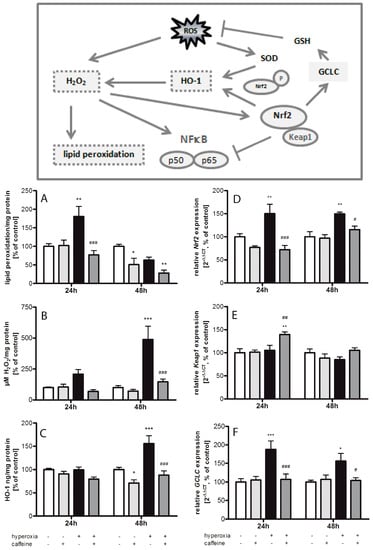 Caffeine reduces oxidative stress responses during exposure to hyperoxia. (Box) Reactive oxygen species imply hydrogen peroxide, which promotes lipid peroxidation. The antioxidant enzyme response is induced, which leads inter alia to an activation of heme oxigenase-1 (HO-1). The Nrf2-Keap1 system plays alongside the NFκB pathway an essential role in the implementation of the antioxidant gene regulation in response to oxidative stress. The catalytic subunit of glutamate-cysteine ligase (GCLC) is upregulated by Nrf2. Quantitation of brain homogenates by ELISA of: (A) TBARS/lipid peroxidation; (B) H2O2; and (C) HO-1; and mRNA expression by quantitative real-time PCR of: (D) Nrf2; (E) Keap1; and (F) GCLC. Groups are shown as normoxia (white bars), hyperoxia (black bars), with and without caffeine (dark grey and light grey bars, respectively) as mean ± SEM, n = 4–5 per group per time point. The 100% value is: (A) 1.268 and 1.959 µM/mg protein; (B) 0.887 and 2.946 µM/mg protein; (C) 3.604 and 2.891 ng/mg protein; (D) 1.008 and 1.029 CT; (E) 1.014 and 1.029 CT; and (F) 1.016 and 1.015 CT for 24 and 48 h groups, respectively. Data were analyzed by two-way ANOVA with Bonferroni post hoc test, with * p < 0.05, ** p < 0.01, and *** p < 0.001 versus control (atmospheric air), and # p < 0.05, ## p < 0.01, and ### p < 0.001 versus hyperoxia (80% oxygen without caffeine).
