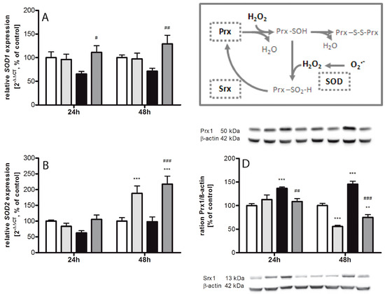 Peroxiredoxin (Prx) and sulfiredoxin (Srx) are important proteins of the thioredoxin family and a key regulator of genes involved in oxidant defense, such as SOD3, Prx1, Srx1, and HO-1, and redox signaling. It is known that non-physiological oxygen concentrations change the balance of the Srx/Prx system in the developing brain [44]. Prx and Srx can act as an antioxidant and Srx solely reduces over-oxidized typical 2-Cys-Prx [45]. Hyperoxic changes elicit reactions of the antioxidant enzyme system, specifically the SODs, which play an essential role in antioxidant defense [37]. Our current data confirm previous studies [44] showing under oxidative stress a significant increase of peroxide reducing protein Prx1 and of antioxidant Srx1 protein expression.