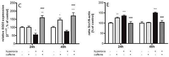 Acute exposure to high oxygen leads to exhaustion of superoxide dismutases 3 (SOD3). SOD1 (Figure 2A) does reveal not statistically significant differences (at 24 h 66% ± 5.4% and at 48 h 72% ± 6.1%), SOD2 (Figure 2B) to 63% ± 7.2% at 24 h, but SOD3 (Figure 2C) was significantly reduced to 55% ± 9.6% (p < 0.05) at 24 h. In comparison to hyperoxia without caffeine, we found significant increases for SOD1 to 111% ± 14.4% (p < 0.05) and 129% ± 18.5% (p < 0.01), for SOD3 to 159% ± 13.1% (p < 0.001) and 171% ± 19.3% (p < 0.001) at 24 h and 48 h, respectively, and for SOD2 to 217% ± 25.5% (p < 0.001) at 48 h. Under 48 h normoxic conditions, a single administration of caffeine leads to an increase of SOD2 (188% ± 23.3%, p < 0.001) and SOD3 (146% ± 11.2%, p < 0.05). Correspondingly, increasing peroxiredoxin (Prx) 1 and sulfiredoxin (Srx) 1 expression were observed at both time points. Prx1 protein expression (Figure 2D) was increased to 137% ± 2.8% (p < 0.001) at 24 h and to 145% ± 6.2% (p < 0.001) at 48 h, and Srx1 protein expression (Figure 2E) to 135% ± 4.3% (p < 0.001) and 150% ± 9.3% (p < 0.001), respectively. The administration of caffeine showed a significant decrease to 109% ± 6.2% (p < 0.01) and 75% ± 5.9% (p < 0.001) for Prx1, and to 99% ± 8.7% (p < 0.001) and 104% ± 9.3% (p < 0.001) for Srx1 to both times examined. Interestingly, there was a reduction in Prx1 at 48 h under normoxia to 56% ± 2.6% (p < 0.001) and an increase of protein expression after 24 h under normoxia to 126% ± 3.6% (p < 0.01).