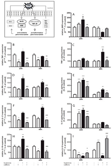 Changes in the expression of cytokines and iNOS in neonatal rat brains after hyperoxic injury with and without caffeine. (Box) Nrf2 activation promotes the expression of anti-oxidative gene transcription and reduces oxidative stress-induced inflammatory activation by blocking the redox-sensitive NFκB pathway (ARE; antioxidant response element). The protein concentration (pg/mg protein) and relative mRNA expression of cytokines were measured in brain homogenates from normoxia (white bars), caffeine with normoxia (light grey bars), hyperoxia (black bars), and hyperoxia with caffeine (dark grey bars) by ELISA assay and quantitative real-time PCR of: (A) iNOS; (B,C) TNFα; (D,E) IFNγ; (F,G) IL-1β; (H) IL-18; and (I) IL-12. Data are shown as mean ± SEM, n = 4–5 per group per time point. The 100% value is: (A) 1.016 and 1.015 CT; (B) 1.021 and 1.018 CT; (C) 21.22 and 29.19 pg/mg protein; (D) 1.012 and 1.013 CT; (E) 1.701 and 2.121 pg/mg protein; (F) 1.021 and 1.010 CT; (G) 16.58 and 8.37 pg/mg protein; (H) 1.026 and 1.016 CT; and (I) 1.006 and 1.019 CT for 24 and 48 h groups, respectively. Data were analyzed by two-way ANOVA with Bonferroni post hoc test, with * p < 0.05, ** p < 0.01, and *** p < 0.001 versus control (atmospheric air), and # p < 0.05, ## p < 0.01, and ### p < 0.001 versus hyperoxia (80% oxygen without caffeine).