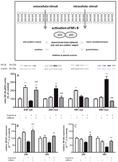 As shown in Figure 4A the nuclear factor of kappa light polypeptide gene enhancer in B-cells (NFκB) protein expression was increased by caffeine under normoxia/hyperoxia at 24 h (237% ± 25.8%; p < 0.001, and 204% ± 36.7%; p < 0.001, respectively) and at 48 h (200% ± 6.0%; p < 0.01) in the cytosol compared to the control group. There were no changes under hyperoxic exposure alone, while the alteration in protein level in the nucleus indicated an up-regulation of NFκB under hyperoxic condition at both time points (224% ± 31.9%; p < 0.001, and 334% ± 36.3%; p < 0.001, respectively). In the nuclear protein fraction, a single dose of caffeine significantly reduced NFκB expression at 24 h to 114% ± 20.8% (p < 0.001), and at 48 h to 74% ± 4.1% (p < 0.001).