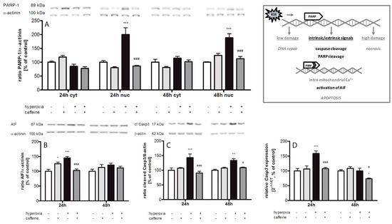 Caffeine inhibits hyperoxia-induced apoptotic key mediators. (Box) ROS-induced DNA damage activated PARP-1, an initially repair enzyme. PARP-1 is a substrate of caspase-3, a member of a highly specialized family of cysteinyl-aspartate proteases (caspases) involved in apoptosis. Upon cleavage and progression of cell death intramitochondrial calcium is released and AIF is induced. Analysis of the expression of apoptotic mediators were conducted in cytosolic (cyt) and nuclear (nuc) protein fraction and relative mRNA expression was measured in brain homogenates of normoxia (white bars), caffeine with normoxia (light grey bars), hyperoxia (black bars), and hyperoxia with caffeine (dark grey bars) by Western blot and quantitative real-time PCR with protein expression of: (A) cleaved PARP-1 (cyt and nuc); (B) AIF (cyt); and (C) cleaved caspase-3 (cyt); and mRNA expression of (D) caspase-3. Data are shown as mean ± SEM, n = 5 per group per time point. The 100% value is: (A) (cyt) 0.051 and 0.760 ratio intensity/mm2 and (nuc) 0.064 and 0.043 ratio intensity/mm2; (B) 0.216 and 0.309 ratio intensity/mm2; (C) 0.691 and 0.823 ratio intensity/mm2; and (D) 1.014 and 1.004 CT for 24 h and 48 h groups, respectively. Data were analyzed by two-way ANOVA with Bonferroni post hoc test, with * p < 0.05, ** p < 0.01, and *** p < 0.001 versus control (atmospheric air), and # p < 0.05, and ### p < 0.001 versus hyperoxia (80% oxygen without caffeine).