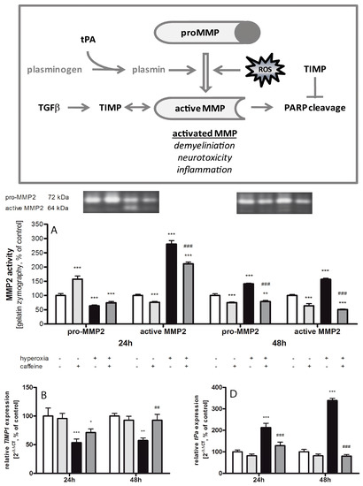 Hyperoxia-mediated imbalance in the MMP-TIMP system counteracted by caffeine. (Box) The matrix metalloproteinase (MMP) system can be activated via the plasminogen/plasmin system, and ROS. Active MMPs affect a variety of extracellular and immune regulatory proteins and are involved in modulating and degrading processes. Active MMPs can be inhibited by tissue inhibitors of metalloproteinases (TIMPs). TGF-β can enhance the expression of MMPs and TIMPs. MMP2 and MMP9 are able to cleave PARP-1. The MMP inhibitor TIMP2 is able to block PARP-1 degradation. The pro and active MMPs were analyzed with gelatin zymography and relative mRNA expression were measured in brain homogenates of normoxia (white bars), caffeine with normoxia (light grey bars), hyperoxia (black bars), and hyperoxia with caffeine (dark grey bars) by quantitative real-time PCR of: (A) pro/active MMP2; (B,C) TIMP1/2 mRNA; (D) tissue plasminogen activator (tPa) mRNA; and (E) TGF-β mRNA. Data are shown as mean ± SEM, n = 4 (for gelatin zymography)-5 per group per time point. The 100% value is (A) (pro) 7.849 × 106 and 0.949 × 106 intensity/mm2 and (active) 11.18 × 106 and 0.731 × 106 intensity/mm2; (B) 1.043 and 1.004 CT; (C) 1.008 and 1.017 CT; (D) 1.013 and 1.026 CT; and (E) 1.018 and 1.010 CT for 24 and 48 h groups, respectively. Data were analyzed by two-way ANOVA with Bonferroni post hoc test, with * p < 0.05, ** p < 0.01, and *** p < 0.001 versus control (atmospheric air), and ## p < 0.01 and ### p < 0.001 versus hyperoxia (80% oxygen without caffeine).