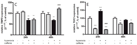 The gene expression of transforming growth factor-(TGF)-β (Figure 6E) is highly increased after 24 h (143% ± 10.4%; p < 0.001) of hyperoxia. Caffeine strongly reduced TGF-β mRNA under normoxia (24 h to 35% ± 3.8%; p < 0.001; 48 h to 64% ± 8.8%; p < 0.01) as compared to control, as well as hyperoxic conditions compared to the hyperoxic group without caffeine (24 h to 29% ± 1.9%; p < 0.001; 48 h to 69% ± 3.6%; p < 0.01) at both time points.
