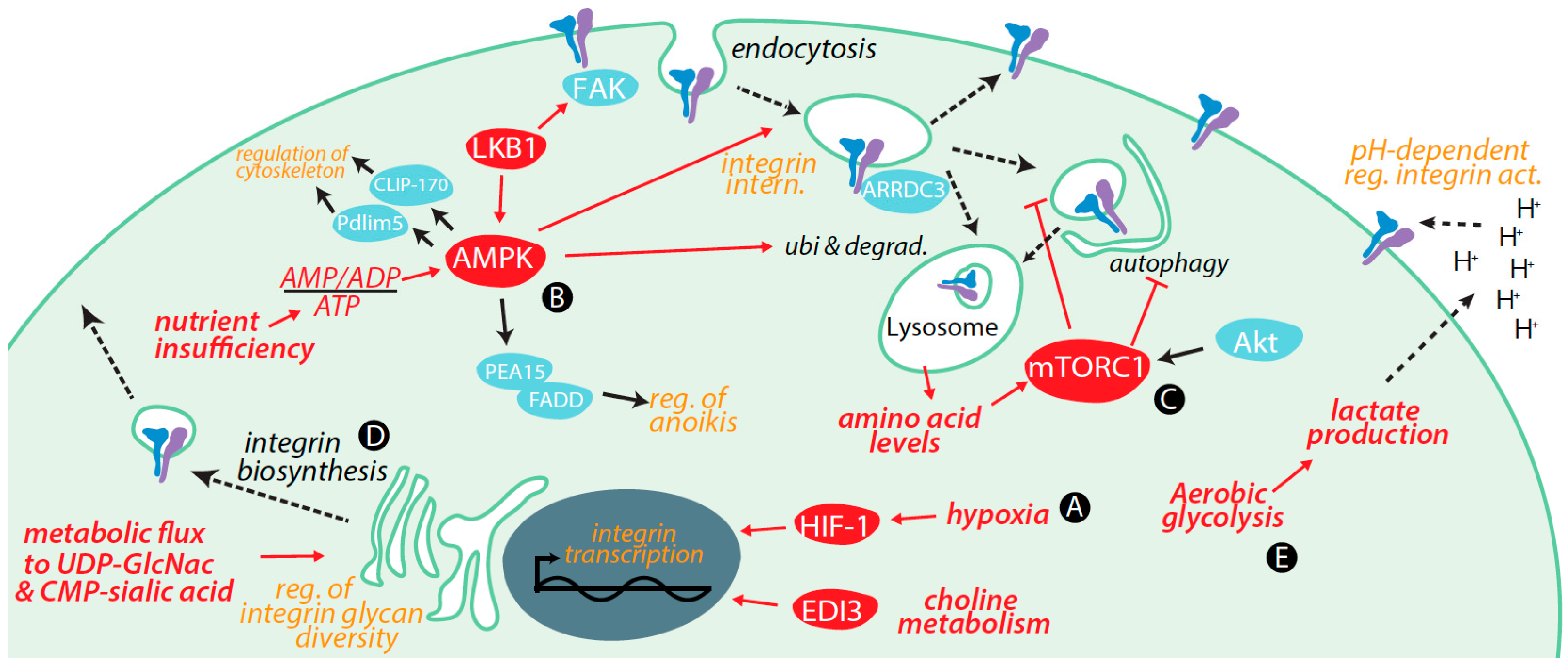 Regulation of integrins by metabolic cues and signaling. (A) Transcriptional regulation of integrins by hypoxia increases expression of α5, β1, and β2 integrins via hypoxia inducible factor (HIF)-1; (B) AMP-activated protein kinase (AMPK) activation elicits internalization of cell surface β1 integrin without affecting expression levels. Long term AMPK activation (24 h) with berberine induced β1 integrin degradation and impaired cell migration. Further control by ubiquitinylation and degradation of β4 integrin occurs via the α-arrestin protein Arrestin Domain Containing 3 (ARRDC3). Cell migration is further controlled by AMPK phosphorylation of Pdlim5 and CLIP-170 to regulate cytoskeleton dynamics. AMPK activation prevents anoikis by phosphorylating phosphoprotein enriched in astrocytes 15 kDa (PEA15), which can then bind to Fas-Associated protein with Death Domain (FADD) to prevent recruitment of initiator caspases; (C) The Arf4-dependent internalization and recycling of α5β1 integrin is regulated by mTORC1, a sensor of amino acid levels. mTORC1 and AMPK have opposite effects on ULK1-dependent autophagy, thus exerting control of integrins by control of autophagy; (D) Glucose and glutamine metabolism allows generation of UDP-GlcNAc, which together with metabolic production of CMP-sialic acid controls the glycan profile of integrins and thus integrin function; (E) Aerobic glycolysis, which is commonly observed in tumours, can lead to reduced extracellular pH. Alterations in extracellular pH control integrin structure, and integrin-dependent cell adhesion and migration. Red lines indicated positive regulation (arrowheads) or negative regulation (bars).