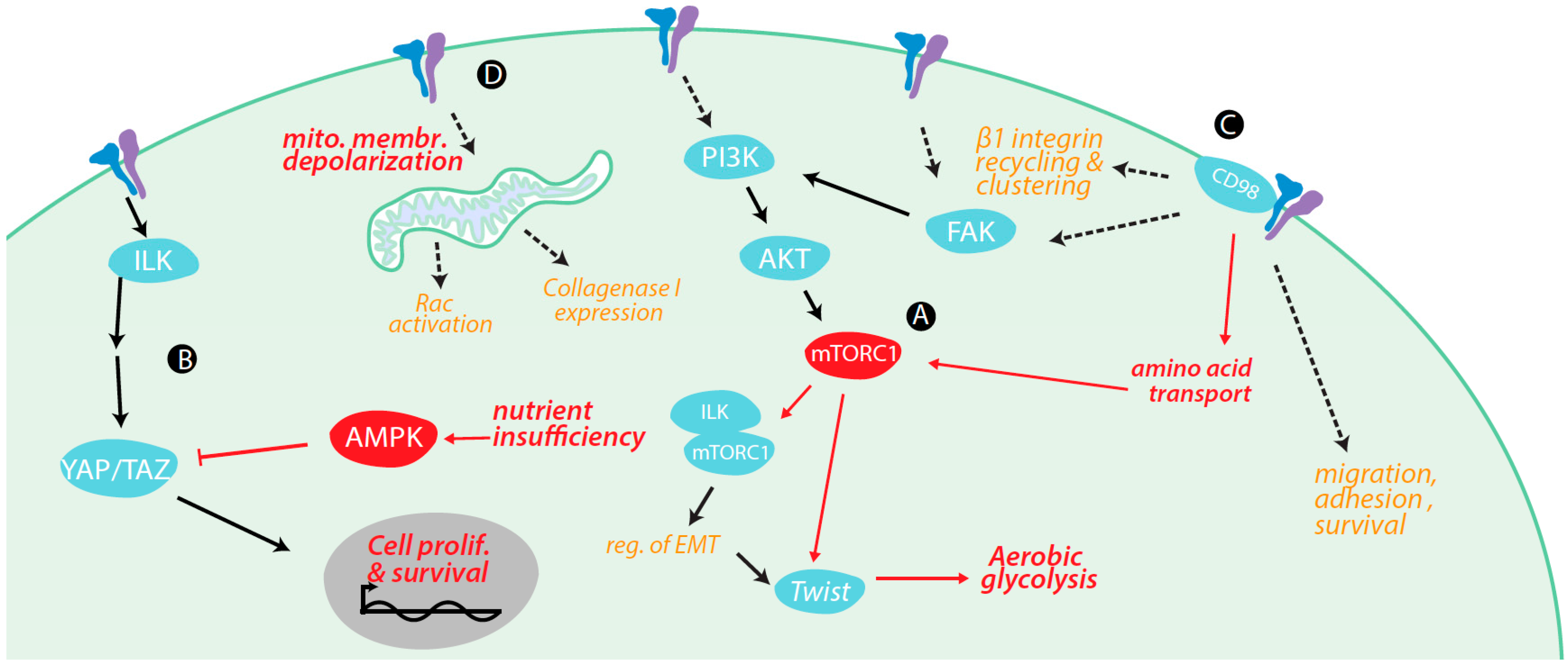 Regulation of metabolism and metabolically-regulated signals by integrins. (A) Focal adhesion kinase (FAK) plays a role in the activation of the PI3K-AKT-mTORC1 pathway upon integrin activation. mTORC1 activation by β1 integrin regulates Twist, which promotes EMT and transition to aerobic glycolysis. TGFβ1 stimulation also leads to integrin-linked kinase (ILK)-dependent PI3K-AKT-mTORC1 pathway, as ILK binds to Rictor, a protein component of mTORC1. The ILK-mTORC1 interaction regulates epithelial-mesenchymal transition (EMT); (B) integrin signaling regulates the Hippo signaling pathway through ILK. ILK inhibits upstream regulators of YAP/TAZ, which allows for YAP/TAZ activation and translocation to the nucleus, and thus upregulation of genes promoting cell proliferation and survival; (C) β1 integrin interacts with CD98, a protein involved in amino acid transport; increased amino acid levels activate mTORC1. CD98 controls β1 integrin recycling and clustering, leading to increased cell surface levels of β1 integrin, and FAK/PI3K signaling events; (D) α5 integrin controls Rac activation and collagenase I expression through a signaling mechanism involving mitochondrial depolarization and ROS production, indicating integrin-dependent control of mitochondrial metabolism. Red lines indicated positive regulation (arrowheads) or negative regulation (bars).
