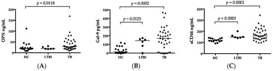 Data are expressed as the median and range. Significance of differences for more than two groups was tested by the Kruskal–Wallis analysis. Significance of differences between two groups was tested by the Mann-Whitney U analysis. Correlations were determined using Spearman′s nonparametric test. These analyses were carried out in the GraphPad Prism 6 software (GraphPad, San Diego, CA, USA). Furthermore, receiver operating characteristic (ROC) curves were constructed to study the diagnostic utility of OPN, Gal-9, sCD44, and IP-10. The area under curve (AUC) and cutoff analyses were conducted by means of the MedCalc statistical software Version 16.8.4 (Ostend, Belgium). A difference was assumed to be significant at p < 0.05.