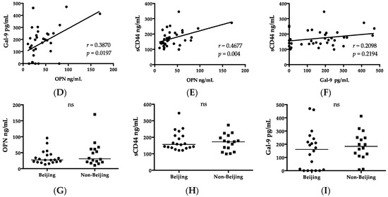 OPN, Gal-9 and sCD44 in groups under study. Comparison of plasma levels of OPN (A); Gal-9 (B); and sCD44 (C) among HC, LTBI, and TB patients. Correlations among OPN, Gal-9, and sCD44 in TB patients (D–F); comparison of OPN (G); Gal-9 (H); and sCD44 (I) between Beijing and non-Beijing genotype.