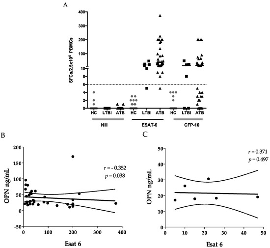 ELISPOTs reaction and OPN levels. ELISPOT assays are plotted as the number of specific PBMCs against the indicated stimulus (A); a negative correlation was observed between the ELISPOT for ESAT-6 and OPN in TB (B); and this correlation was not seen in the LTBI group (C).